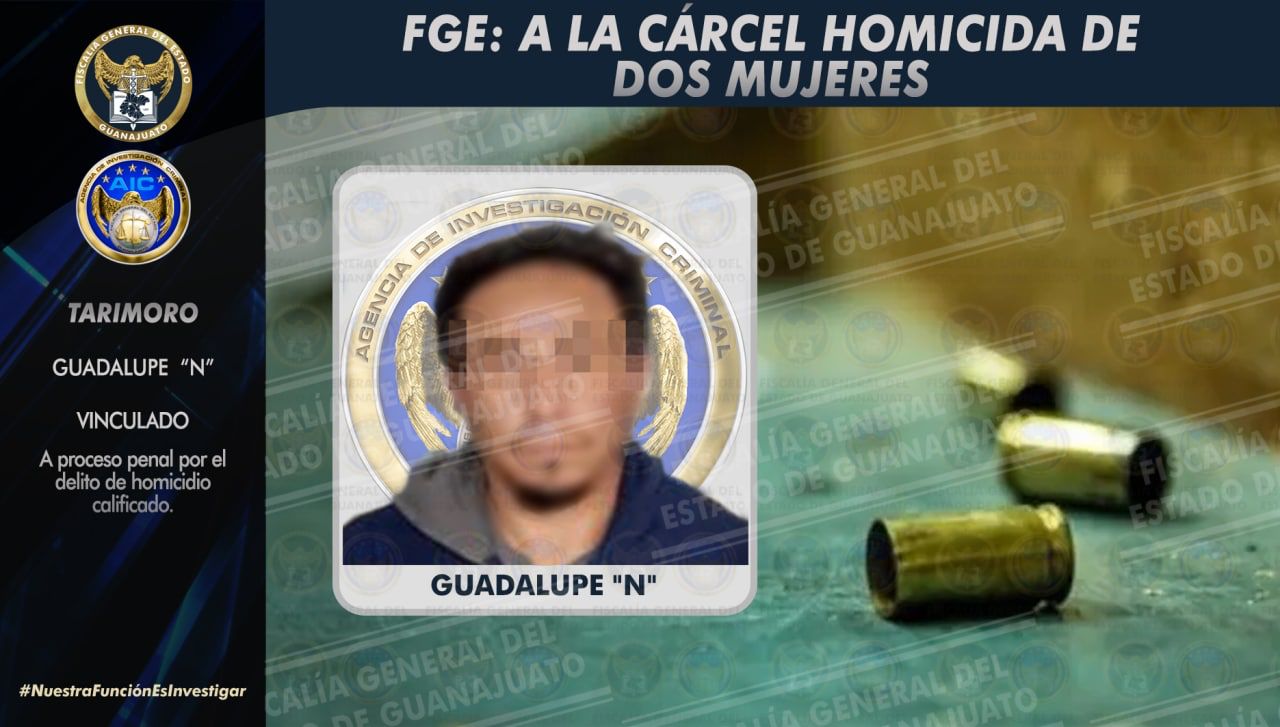 Tarimoro, Gto. 21 de enero de 2022.- Dos mujeres fueron cruelmente asesinadas a balazos cuando se encontraban en su domicilio a finales de julio del año pasado; derivado de este doble homicidio, la Fiscalía General del Estado inició una investigación que arrojó resultados determinantes para el esclarecimiento del crimen al detener a GUADALUPE “N”, como probable responsable.