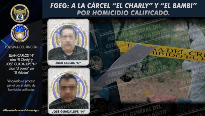 Purísima del Rincón, Gto. 21 de diciembre de 2021.- El macabro hallazgo de un hombre maniatado y con huellas de violencia que cimbró a la comunidad la Alameda de Purísima del Rincón, ha sido esclarecido por la Fiscalía General del Estado, tras haber arrestado con orden judicial a *JUAN CARLOS “N”* alias “EL Charly” y a *JOSÉ GUADALUPE “N”*, alias “El Bambi” y/o “El Valadez”, quienes ya fueron vinculados a proceso penal, acusados por el delito de homicidio calificado.