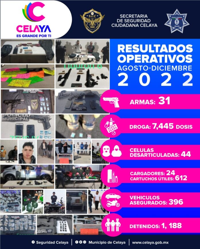 La Secretaría de Seguridad Ciudadana de Celaya (SSCC) informa que, del mes de agosto al 14 de diciembre de este año, se han tenido diversas detenciones y aseguramientos en un trabajo conjunto con el C4.