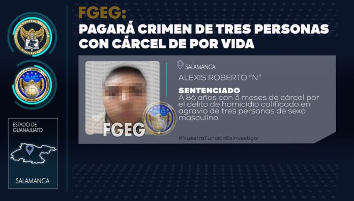 Salamanca, Gto. 28 de junio de 2022.- Un sujeto que asesinó a tres hombres que se encontraban en el área del estacionamiento del Panteón Villa de la Paz, ha sido sentenciado a 86 años con 3 meses de cárcel. El 12 de octubre de 2019, cerca de las 14:28 horas, *ALEXIS ROBERTO “N”*, y otros, rafaguearon a las víctimas, cuyos cuerpos fueron localizados en diferentes áreas, al interior del camposanto.