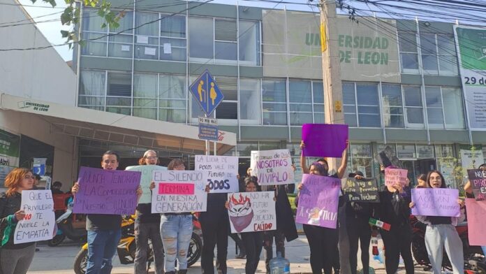 Celaya; Gto.- Un grupo de alumnos de la Universidad de León, organizaron una queja que mostraron frente al plantel esta mañana, por acoso sexual e insinuaciones a las alumnas, sumadas a instalaciones deterioradas e inseguridad.