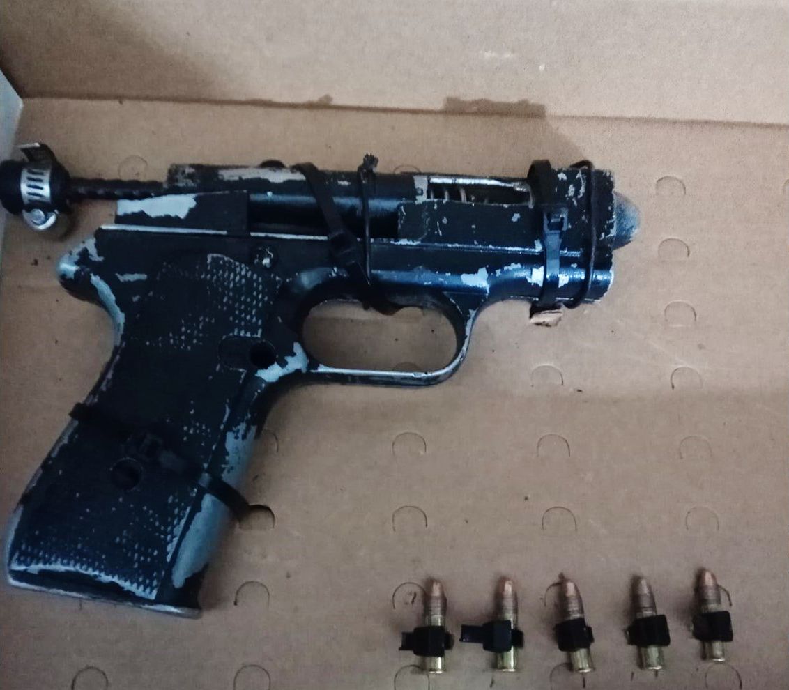 Al momento de la detención se le aseguró un arma de manufactura artesanal adaptada para calibre .22 milímetros y 5 cartuchos del mismo calibre.