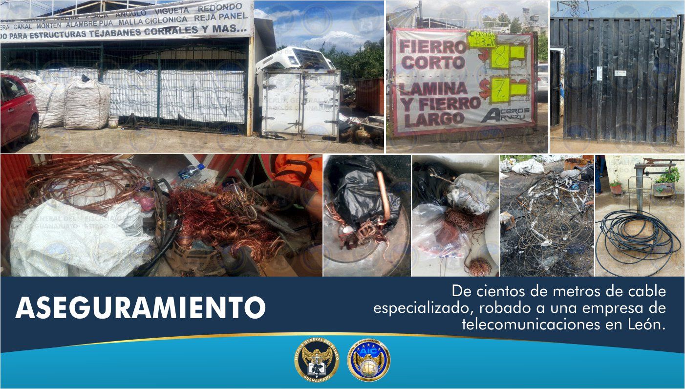 León, Gto.- Derivado de una serie de cateos encabezados por agentes especializados del Ministerio Público con apoyo de un equipo multidisciplinario de la Agencia de Investigación Criminal, se logró el aseguramiento de cientos de metros de cable especializado, robado a la empresa Teléfonos de México (TELMEX).