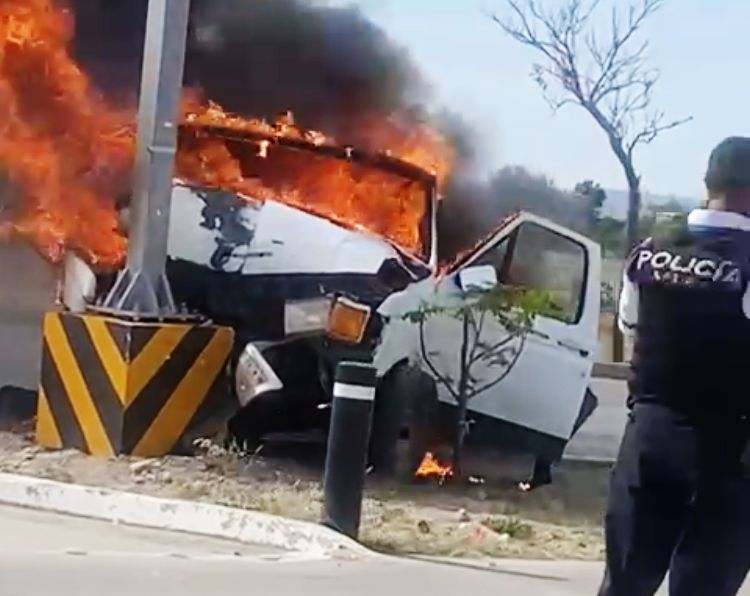 Paramédicos de Cruz Roja y elementos de Bomberos de Protección Civil Municipal arribaron a la zona del accidente, quienes apagaron el fuego de la camioneta, encontrando a un hombre lesionado, aparentemente el conductor, así como el copiloto que ya no contaba con signos vitales.