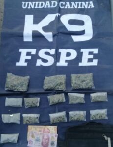 Captura Peggy de la Unidad Canina K9 de las FSPE en la ciudad de León, a un hombre con 111 dosis de mariguana.