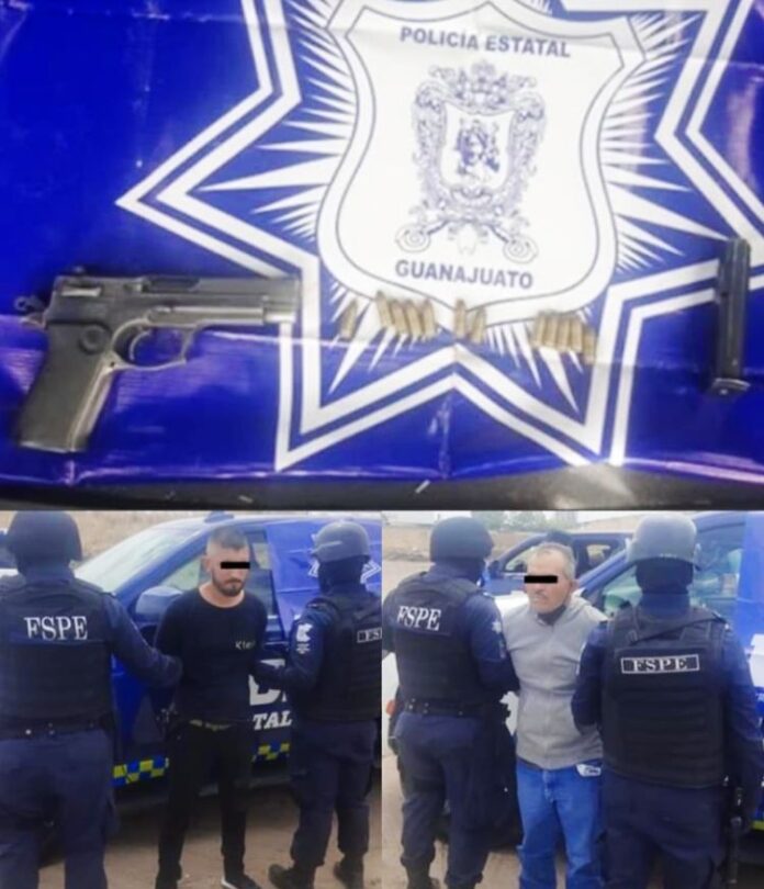 León Gto.- 24 de junio de 2022.- Elementos de las Fuerzas de Seguridad Pública del Estado (FSPE) aseguraron durante patrullajes implementados en este municipio, a dos hombres presuntamente señalados por el robo a un comercio, estaban en posesión de un arma de fuego calibre .9 milímetros, así como 18 cartuchos útiles.