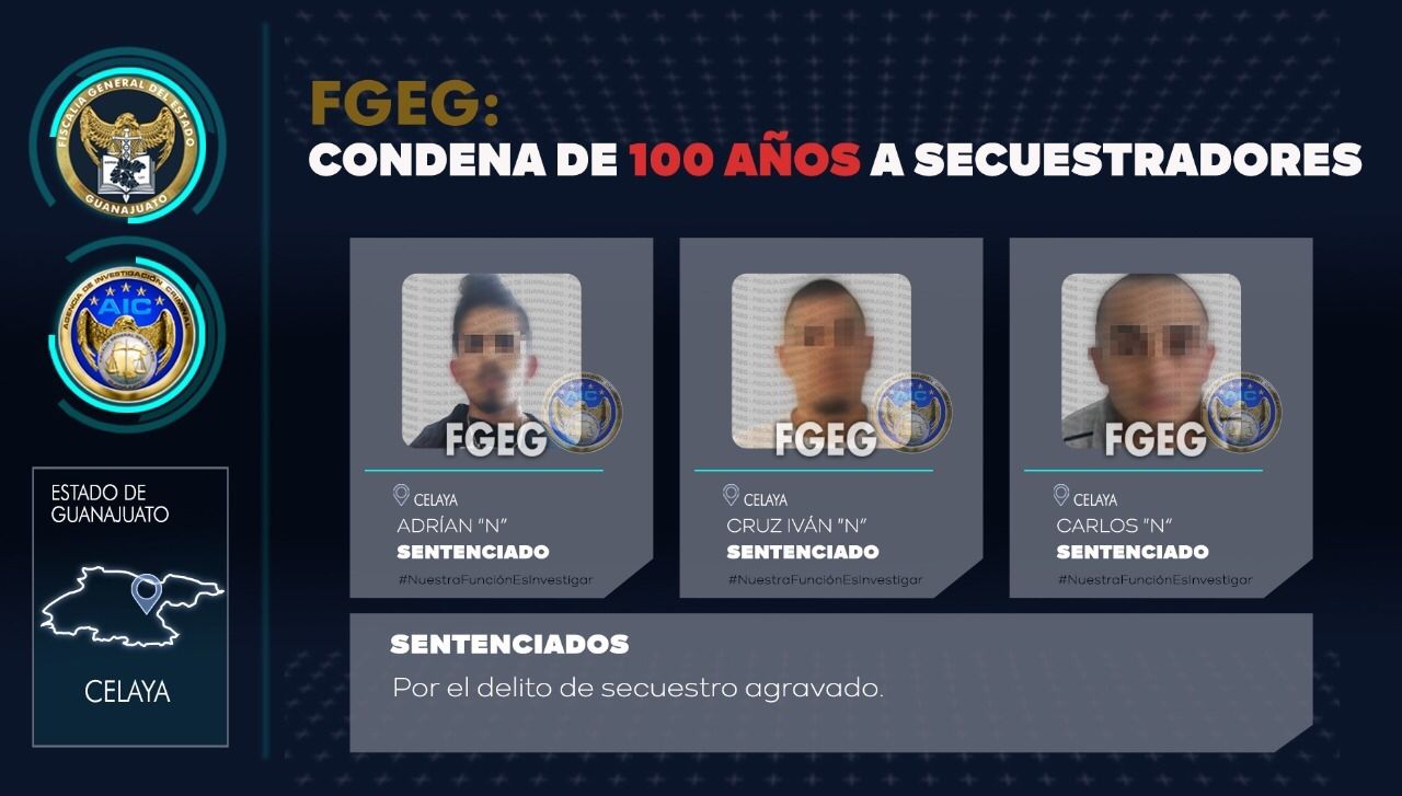 Celaya, Gto., 30 de junio de 2022.- La carrera delictiva de tres sujetos quedó finiquitada. En audiencia de juicio oral, *CRUZ IVÁN “N”, CARLOS “N” y ADRÍAN “N”*, fueron sentenciados a 100 años de prisión, al ser hallados culpables del delito de secuestro agravado, los secuestradores mantuvieron durante varios días privados de su libertad, a dos víctimas, en una casa de seguridad en Celaya.