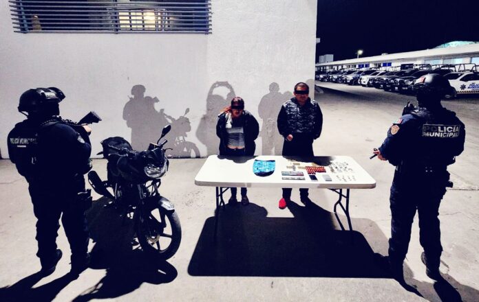 Celaya, Gto.- En patrullajes de disuasión del delito en la colonia Rancho Seco, elementos de la Policía Municipal del Grupo de Operaciones Especiales de Celaya (GOEC), detuvo a un hombre y una mujer como presuntos integrantes de una célula dedicada a la distribución de droga.