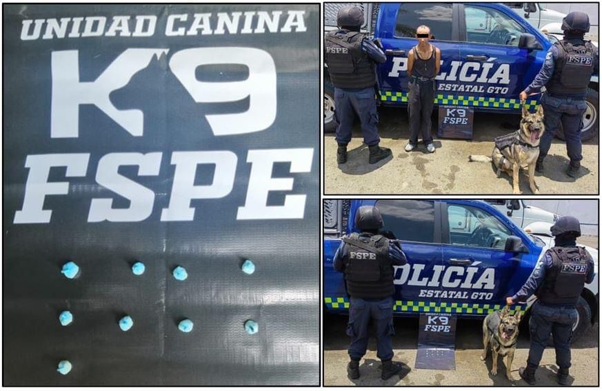 León, Gto.- A través de labores de vigilancia y prevención realizadas por elementos de la Unidad Canina K9 de las Fuerzas de Seguridad Pública del Estado, lograron asegurar en la zona urbana a un hombre que estaba en posesión de 18 dosis de la droga con las características del cristal.