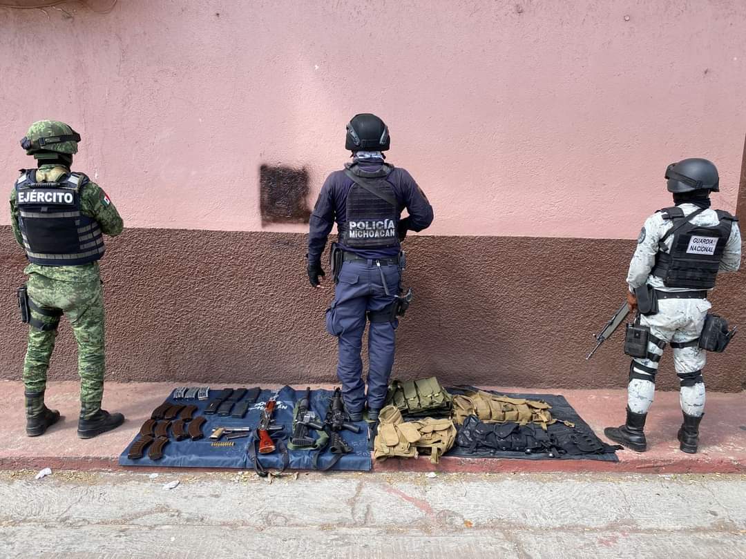 #Chavinda, Mich.– En un acción operativa policía de Michoacán, la Secretaría de la Defensa Nacional (SEDENA) y de la Guardia Nacional (GN) aseguraron a cuatro personas del sexo masculino, dos de ellas menores de edad, quienes se encontraban en posesión de cuatro armas de fuego, 370 cartuchos útiles, 19 cargadores y diversas prendas tácticas.