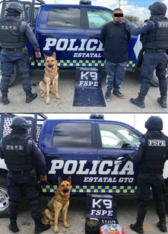 León, Gto., 09 de febrero de 2022.- Durante labores de vigilancia y prevención, el elemento Sony de la Unidad Canina K9 de las Fuerzas de Seguridad Pública del Estado, capturó en esta ciudad a un hombre que estaba en posesión de 585 dosis de la droga con las características de la mariguana y el cristal.