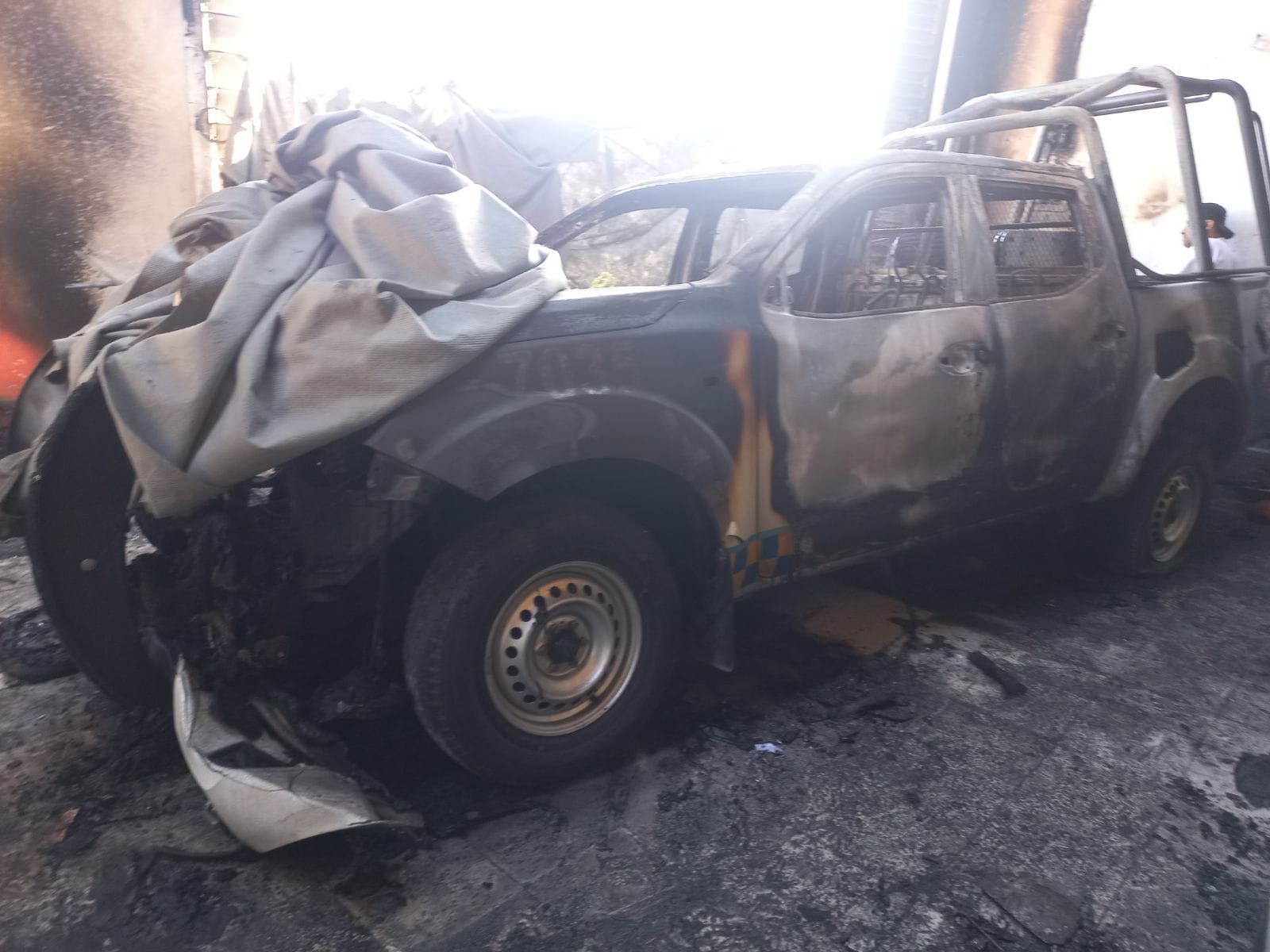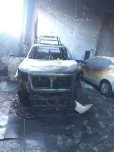 Dos unidades de seguridad pública y una de Tránsito y Vialidad fueron incendiadas al interior de un taller de hojalateria en Celaya.