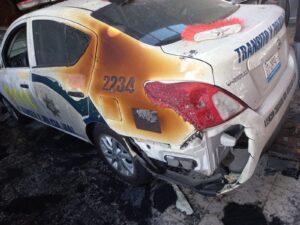 Autoridades arribaron al lugar donde encontraron dos patrullas de la Secretaría de Seguridad Ciudadana en pérdida total y un auto de Transito y policía municipal con daños.