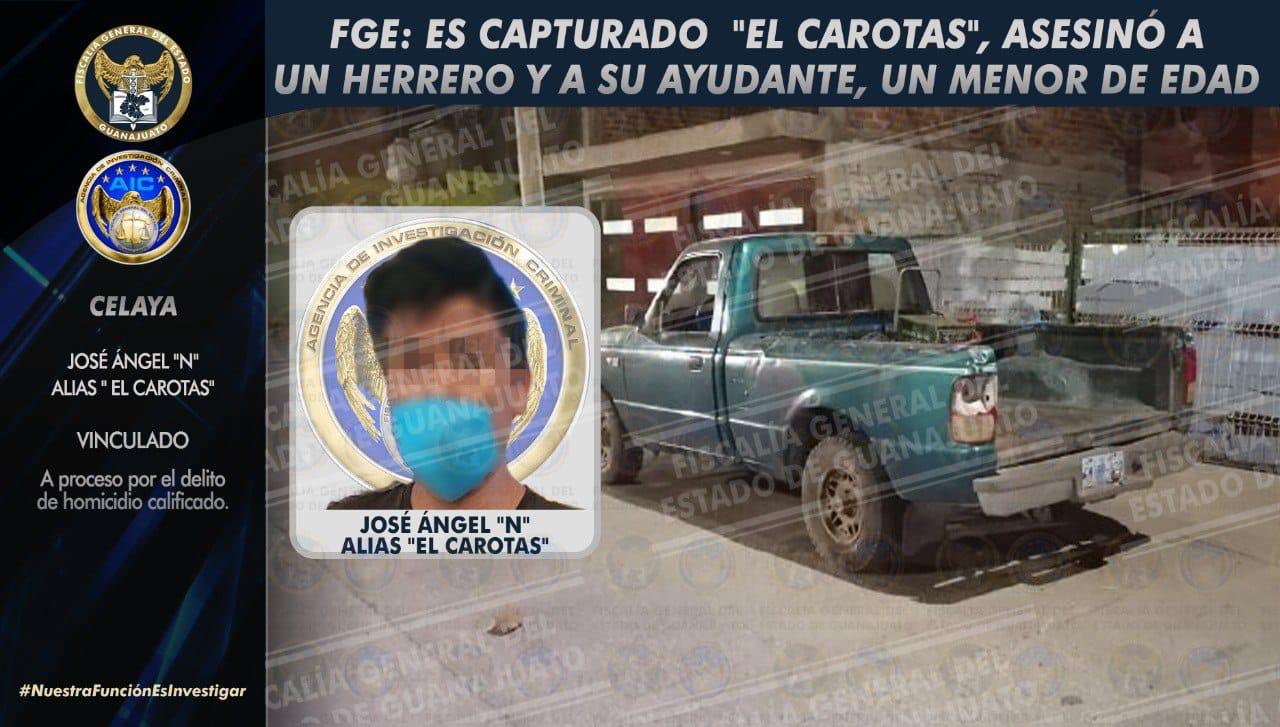 Celaya, Gto. 20 de febrero de 2022.- En seguimiento a la investigación para esclarecer el asesinato de José “N” quien era herrero de oficio, y de un menor de 16 años de edad que trabajaba con él, la Fiscalía General del Estado capturó con orden judicial a JOSÉ ÁNGEL “N” alias “El Carotas”, quien ya se encuentra en la cárcel vinculado proceso penal por el doble homicidio.
