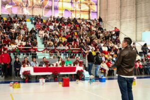 El Presidente Municipal Lic. Israel Mosqueda, comparte la alegría navideña con niñas y niños de institución educativa.