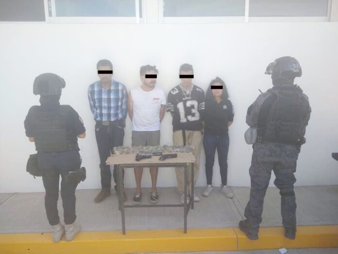 Celaya, Gto.- Cuatro personas fueron detenidas por la Policía Municipal en posesión de hierba verde y seca con las características de la mariguana y dos réplicas de armas de fuego.