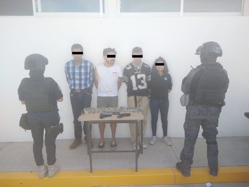 Al acercarse a ver lo ocurrido, los sospechosos huyeron hacía un vehículo tripulado por un hombre y una mujer, mismos que fueron detenidos y al ser revisados, se les encontraron 26 bolsas con hierba verde con las características de la mariguana y dos réplicas de armas de fuego.