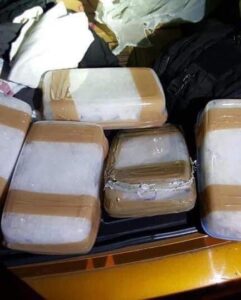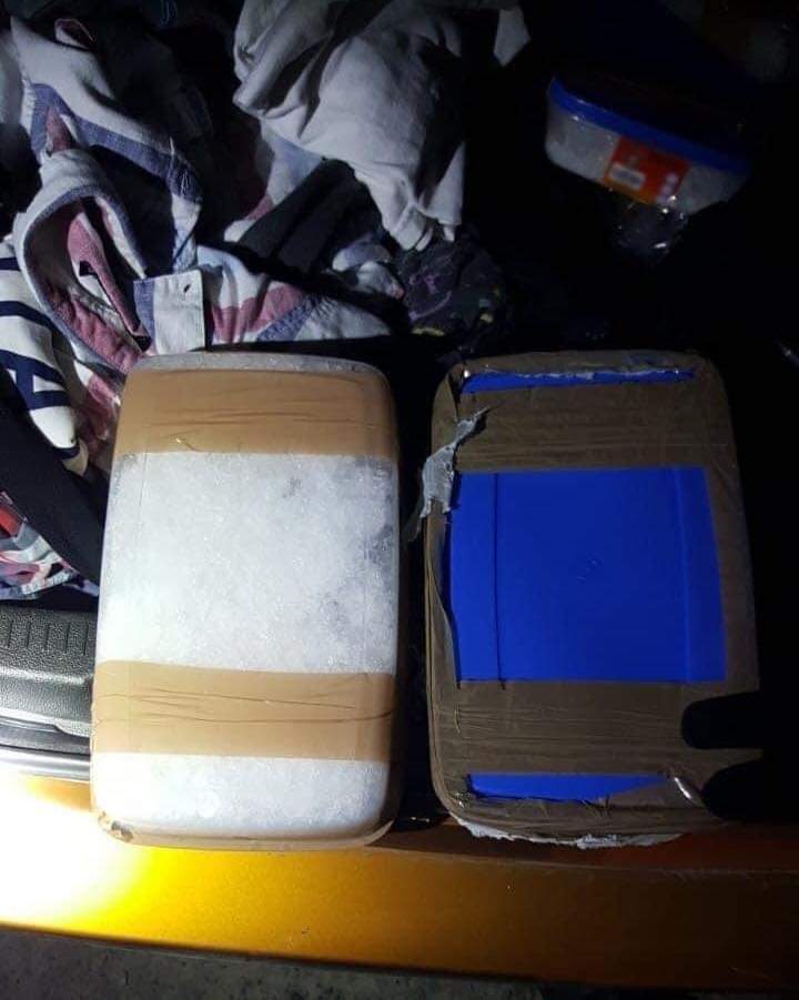 Al aproximarse a la unidad percibieron un fuerte olor a químico en el área de la cajuela, en donde hallaron una mochila con cinco recipientes de plástico que contenían la droga.