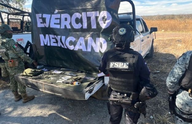 Tras la inspección se logró asegurar los vehículos, ambos con reporte de robo vigente, un arma larga, 194 cartuchos útiles, seis cargadores, tres chamarras tácticas con patrón pixelado, un casco balístico, un chaleco balístico y una funda para arma corta.