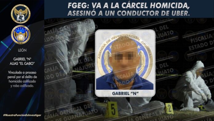 León, Gto.- En seguimiento a la investigación para esclarecer el asesinato de Joel “N”, quien era conductor de un taxi de la plataforma digital denominada “UBER”, la Fiscalía General del Estado detuvo con orden judicial a GABRIEL “N” alias “El Gabo”, quien ya se encuentra en la cárcel vinculado proceso penal por el crimen.