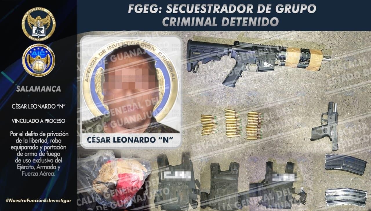 El detenido, aun con ropa militar y chaleco, es puesto a disposición junto con un arma larga de fuego color negro, calibre 223, un arma corta marca Taurus, color negro, calibre 9mm; dos cargadores metálicos, celulares y el vehículo de motor de la marca Ford, F150, color gris, doble cabina, además de cartuchos calibre 223, tres chalecos tácticos con iniciales del grupo delincuencial, entre otros objetos del delito.