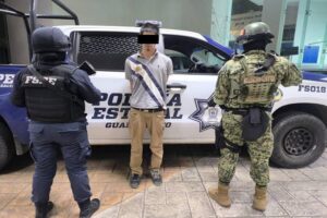 Fuerzas de los tres niveles de gobierno detuvieron en Yuriria, a dos personas con armamento, droga y vehículos.