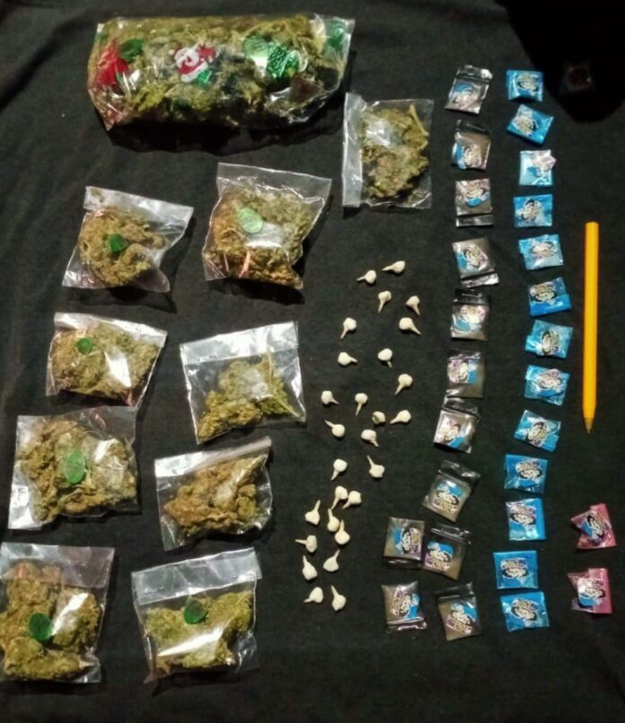 Al momento de la detención se les aseguraron 28 envoltorios de presunto cristal, 10 envoltorios de presunta marihuana y 27 envoltorios de al parecer cocaína.