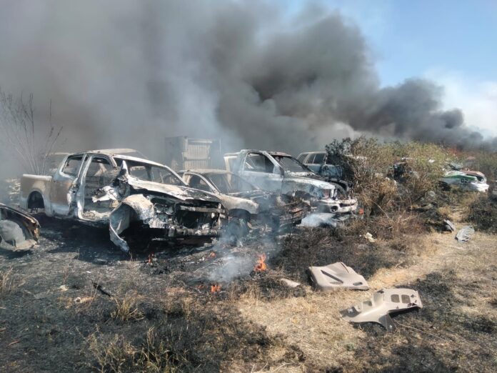 Villagrán, Gto.- Un fuerte incendio consumió alrededor de 10 autos que se encontraban en la pensión municipal, después de casi dos horas de labores, cuerpos de emergencia lograron apagar el fuego.