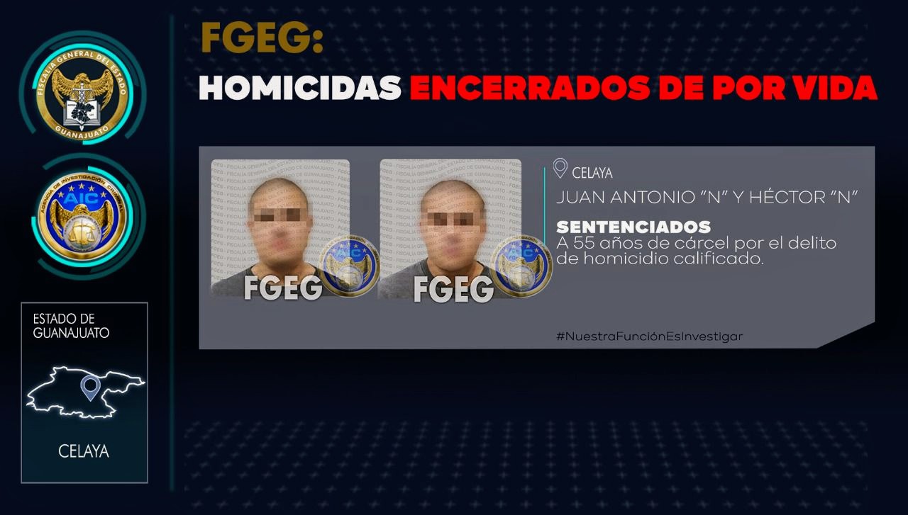 Celaya, Gto., 10 de junio de 2022.- Derivado de la comisión del delito de homicidio calificado, la Fiscalía General del Estado acreditó, con un conjunto de elementos objetivos, la responsabilidad penal de dos sujetos en su comisión. Los elementos probatorios y las diligencias practicadas para probar la existencia del delito y las circunstancias en que se cometió, fueron suficientes para obtener una sentencia de 55 años para JUAN ANTONIO “N” y HÉCTOR “N, respectivamente.
