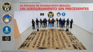 Con trabajo de investigación y labores de inteligencia, la Fiscalía de Guanajuato rastreó y ubicó el arsenal en coordinación con la SSPE y el Ejército Mexicano, además se aseguraron cartuchos y cargadores útiles, droga, dinero en efectivo, vehículos y detuvieron a dos hombres y dos mujeres.