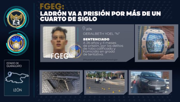 Con los elementos de prueba presentados ante el Juez y en audiencia de juicio oral, la Fiscalía General del Estado obtuvo sentencia condenatoria por el delito de robo calificado y por homicidio en grado de tentativa en agravio de un servidor público en funciones de seguridad pública; en contra del colombiano *GERALBETH YOEL “N”*, imponiéndole una pena de 26 años y 4 meses de prisión.