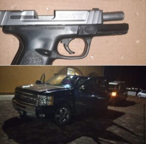Los policías les solicitaron bajar de la camioneta para realizar una inspección de rutina y encontraron al interior un arma de fuego, marca Smith & Wesson, así como 4 cartuchos útiles calibre 9 milímetros; mismos que fueron asegurados.