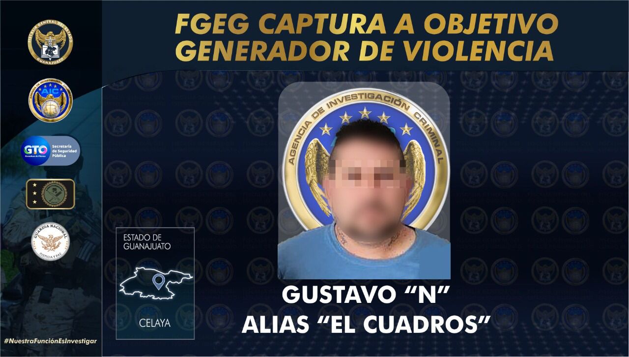 – En un despliegue de fuerzas federales y estatales en Celaya se logró la captura de GUSTAVO “N” alias “El Cuadros”.