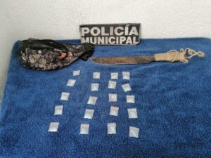 En ese momento dos hombres sospechosos fueron observados y en la revisión de sus pertenencias, se les encontró en posesión de 20 bolsitas que contenían una sustancia granulada con las características del cristal y un machete.