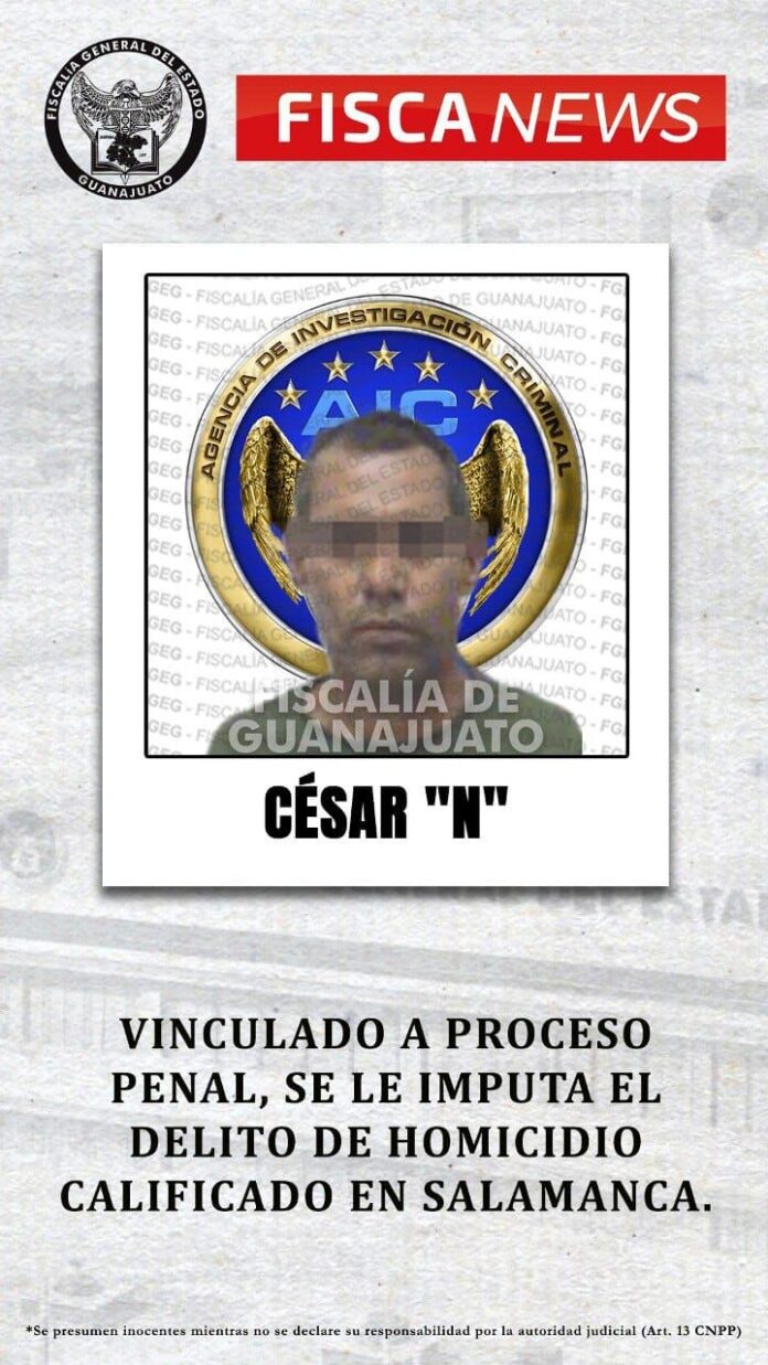 CÉSAR “N”, ha sido vinculado a proceso penal por homicidio calificado, luego de que la Fiscalía de Guanajuato aportó elementos de prueba, días después de que dicho sujeto perpetró un ataque con arma de fuego, en el interior de un domicilio de la colonia Rinconada San Javier, donde fueron asesinados un hombre y una mujer, el pasado 04 de junio en Salamanca.