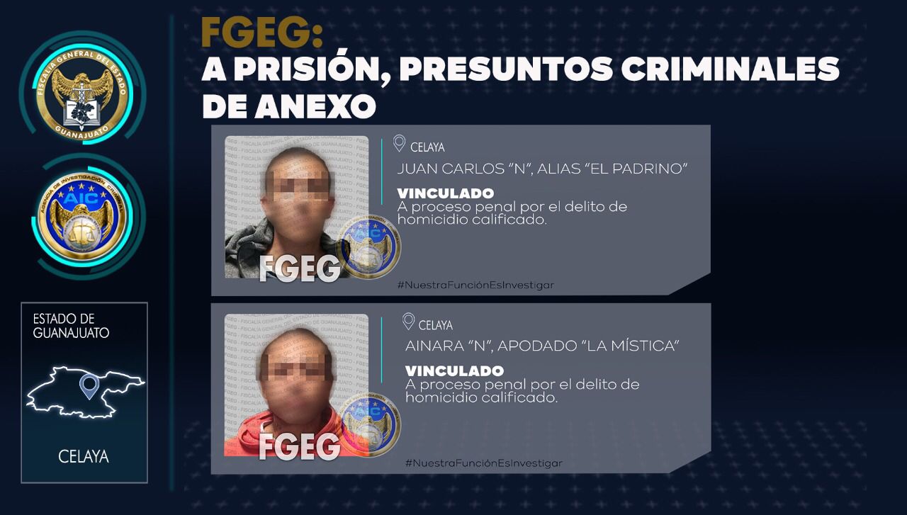 De esta forma se pudieron recopilar elementos probatorios para solicitar la detención de dos de los “padrinos” del anexo, identificados como JUAN CARLOS “N” y AINARA “N”. ambos, conocidos como “El Padrino” y “La Mística”, quienes fueron vinculados a proceso penal por el delito de homicidio calificado.