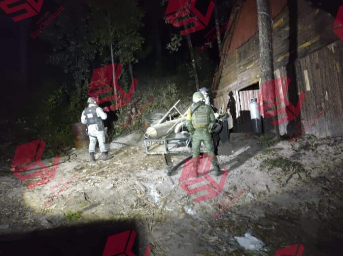 Elementos de la Secretaría de la Defensa Nacional aseguraron una cabaña que se empleaba como laboratorio clandestino para elaboración de droga sintética.