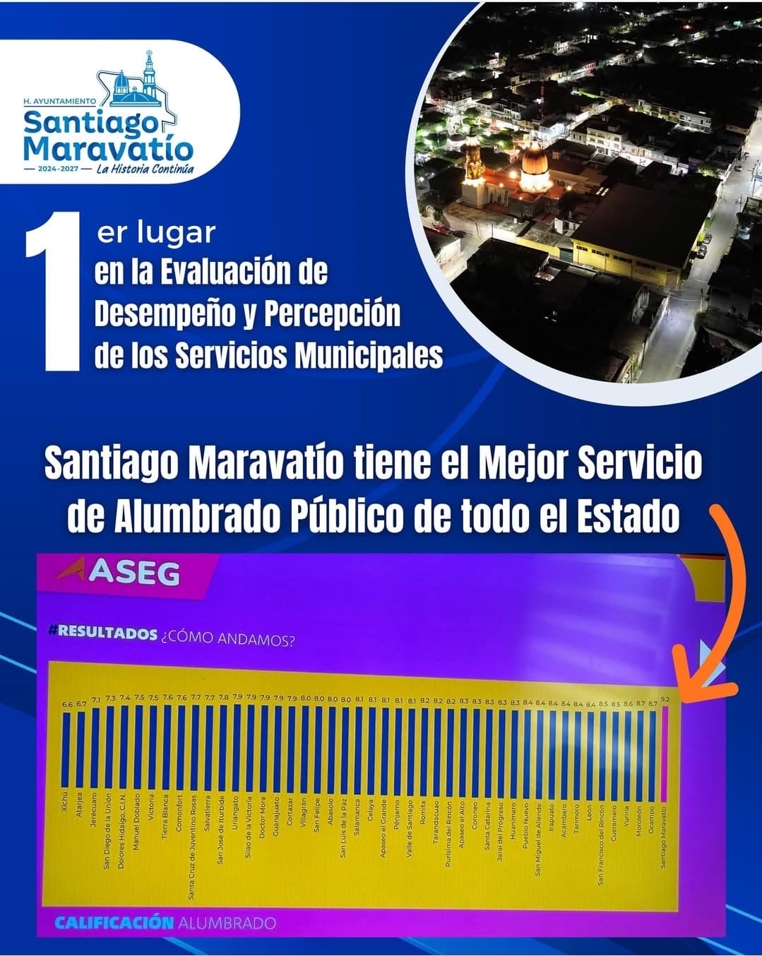 Santiago Maravatio Gto.- El municipio de Santiago Maravatío, obtuvo el primer lugar a nivel estatal en la Evaluación de Desempeño y Percepción de los Servicios Municipales, realizada por la Auditoría Superior del Estado de Guanajuato (ASEG) dentro del estudio “¿Cómo andamos Guanajuato?”.