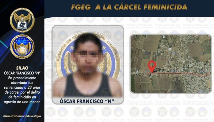 Silao, Gto. 18 de noviembre de 2021.- El hombre que estranguló a una menor de edad al interior de su domicilio ubicado en la comunidad El Coecillo, el pasado 06 de marzo de este año, identificado como ÓSCAR FRANCISCO “N”, fue sentenciado bajo procedimiento abreviado a una pena privativa de libertad de 23 años. El feminicida aceptó su intervención en los hechos y pidió perdón por su conducta criminal.