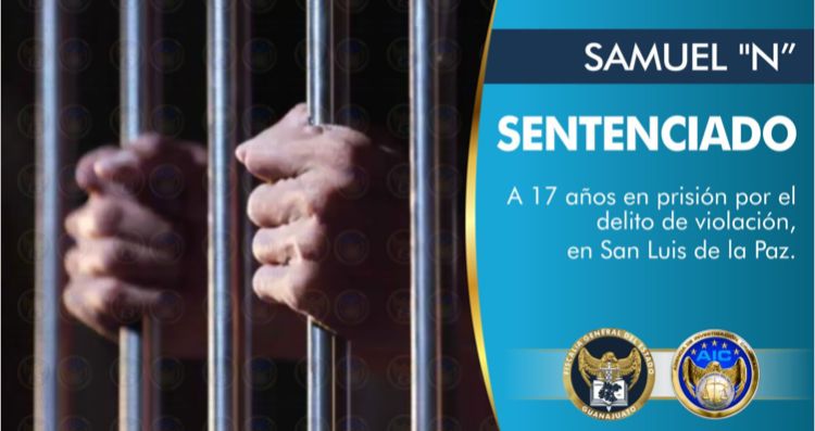 San Luis de la Paz, Gto. – En procedimiento abreviado la Fiscalía General del Estado (FGE), a través del trabajo de investigación desarrollado por la Unidad de Atención Integral a las Mujeres (UNAIM), obtuvo sentencia condenatoria de 17 años en prisión para SAMUEL “N”, culpable del delito de violación en agravio de una víctima menor de edad.