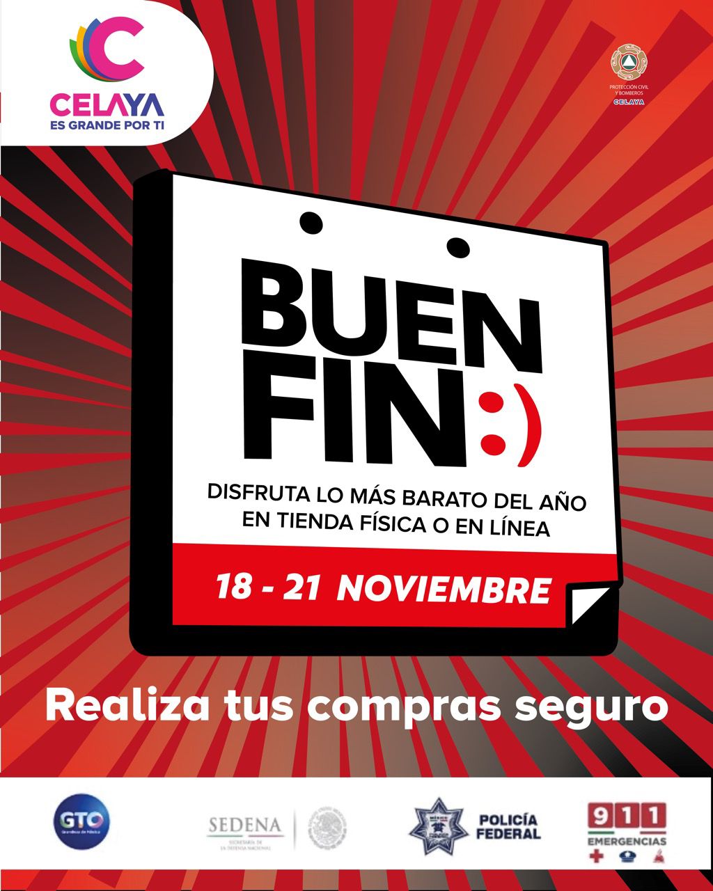 Celaya, Gto.- La Secretaría de Seguridad Ciudadana de Celaya (SSCC) informa que ya se encuentra preparado el dispositivo de seguridad que se implementará del viernes 18 al lunes 21 de noviembre durante el llamado “Buen Fin”.