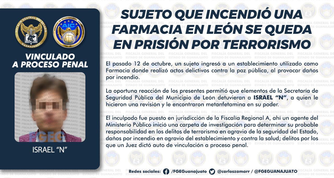 SUJETO QUE INCENDIÓ UNA FARMACIA EN LEÓN SE QUEDA EN PRISIÓN POR TERRORISMO