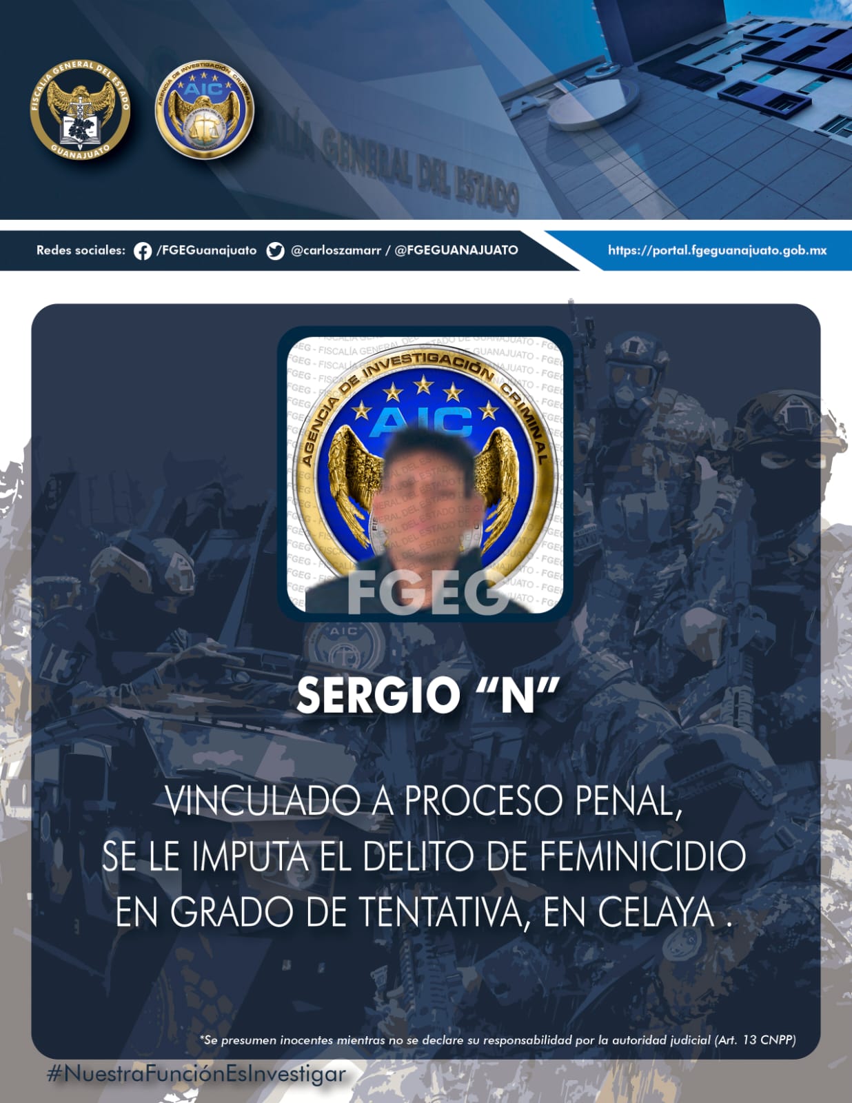 Celaya, Gto., 14 de febrero de 2023.- La Fiscalía General del Estado detuvo a SERGIO “N” de 33 años por el delito de feminicidio en grado de tentativa. El imputado intentó encubrir su conducta delictiva al afirmar que la víctima trató de ahorcarse.