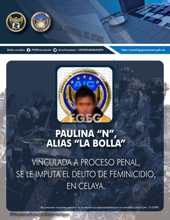Celaya, Gto., 17 de febrero de 2023.- La Fiscalía General del Estado cumplimentó una orden de aprehensión en contra de una mujer apodada “La Bolla”, por el delito de feminicidio. La víctima fue una adolescente, quien fue asesinada a balazos en una calle de la colonia Santa Teresita, el pasado 14 de noviembre de 2022.
