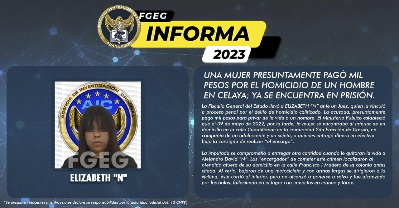 La Fiscalía General del Estado llevó a ELIZABETH “N” ante un Juez, quien la vinculó a proceso penal por el delito de homicidio calificado. La acusada, presuntamente pagó mil pesos para privar de la vida a un hombre. El Ministerio Público estableció que el 09 de mayo de 2022, por la tarde, la mujer se encontraba al interior de un domicilio en la calle Cuauhtémoc en la comunidad 2da Fracción de Crespo, en compañía de un adolescente y un sujeto, a quienes entregó dinero en efectivo bajo la consigna de realizar “el encargo”.