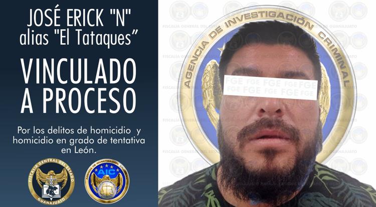 León, Gto. – En audiencia de formulación de imputación un agente especializado de la Fiscalía General del Estado, obtuvo que José Erick “N”, alias “El Tataques”, fuera vinculado a proceso penal, por los delitos de homicidio en agravio de un hombre y homicidio en grado de tentativa en agravio de otro más en León.