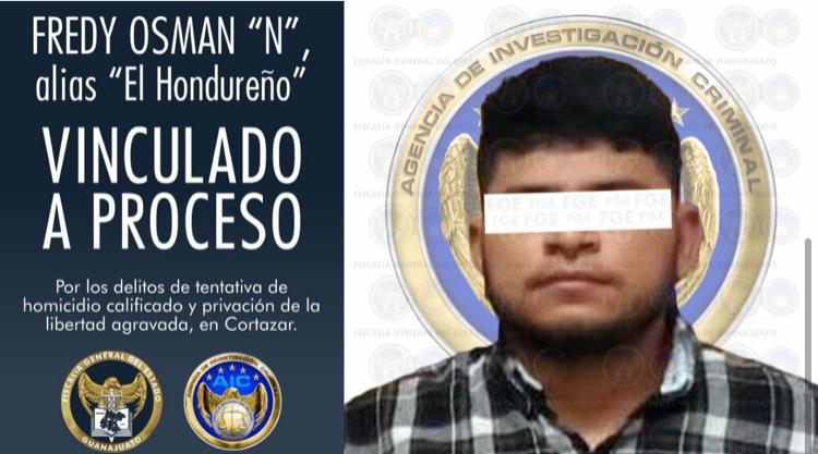 Cortazar, Gto.- Un sujeto apodado “El Hondureño” fue vinculado a proceso penal por los delitos de tentativa de homicidio calificado y privación de la libertad agravada, en hechos ocurridos el 12 de febrero de 2021. Fredy Osman “N”, junto con otros dos sujetos, mantenían privados de su libertad a una pareja en un domicilio de la zona centro de esta ciudad, y lesionaron gravemente a una de las víctimas.